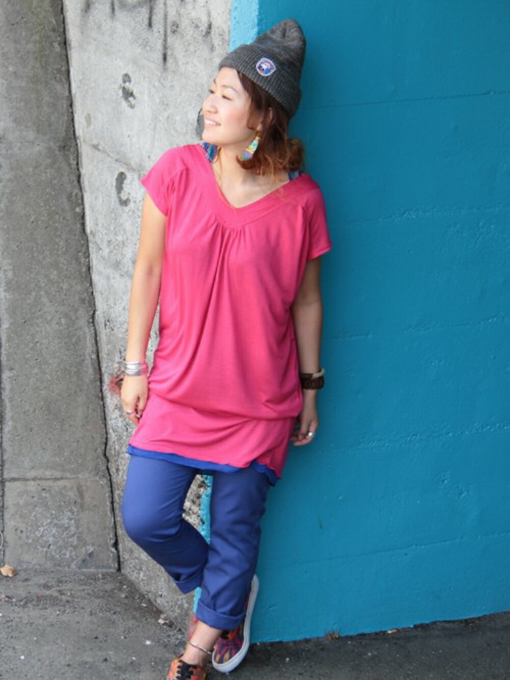 ショッキングピンクのビビッドなワンピースをストリートっぽく着こなしました◎ スキニーパンツとスニーカーでカジュアルさを前面的にアピール☆