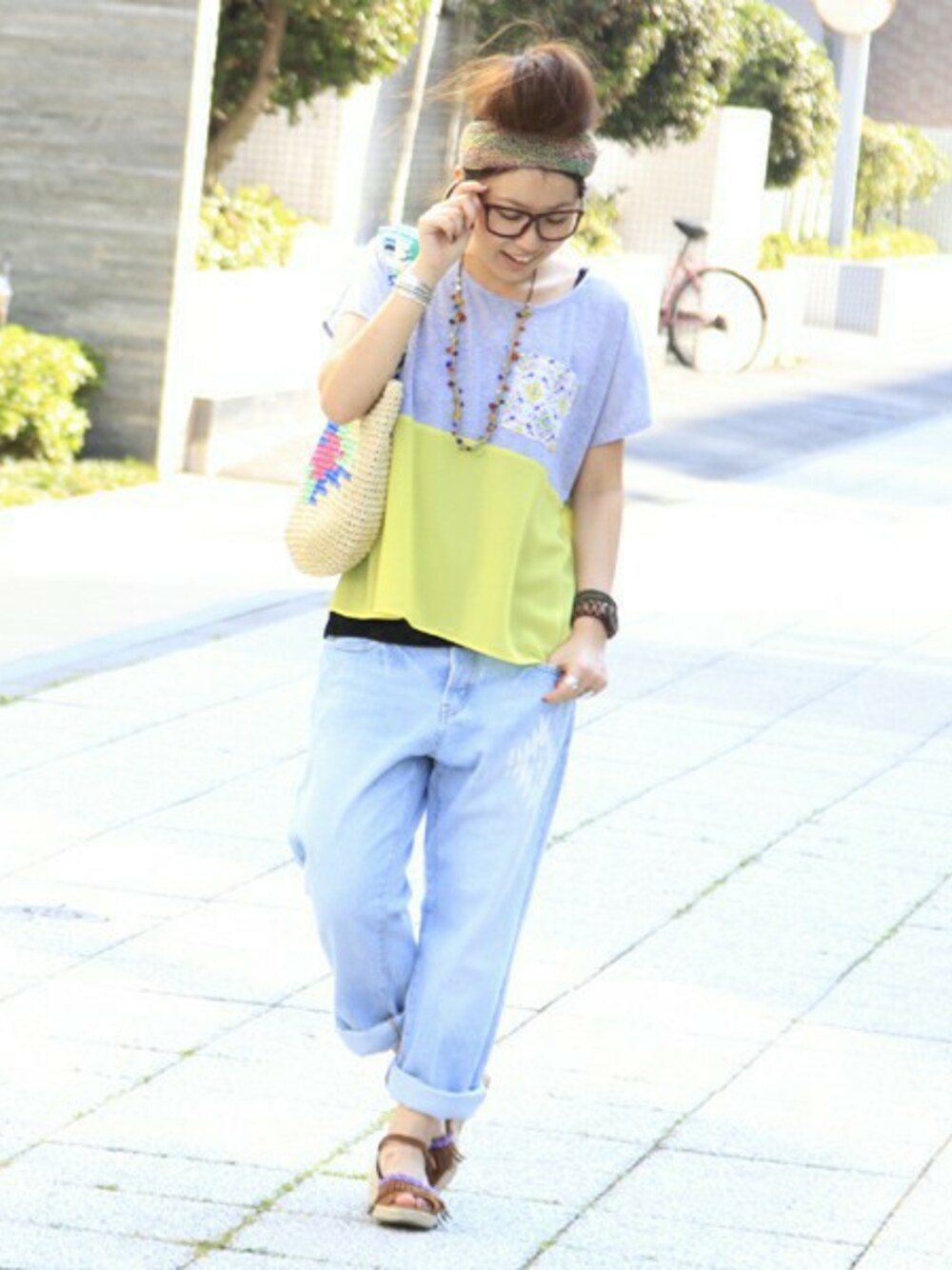2トーン配色のゆったりプルオーバーをデニムに合わせて。 柔らかいカットソー素材とネオンカラーのシフォン素材を使った軽やかな生地が夏らしい表情に。 ポケットや襟元にさりげなくお花柄が施されているのも胸キュンポイント☆ 夏の太陽の下で大人カジュアルコーデを♪