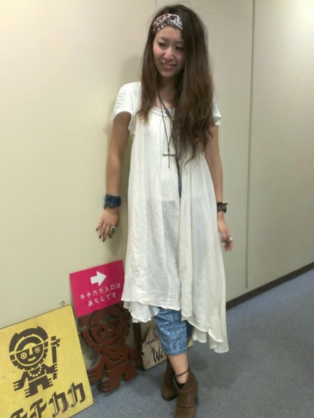 裾にネイティブ調のプリントが施されたパンツをアシンメトリーのふんわりワンピからチラリ覗かせて。夏らしくアロハ柄のヘアバンドをプラスして、爽やかな雰囲気に♪