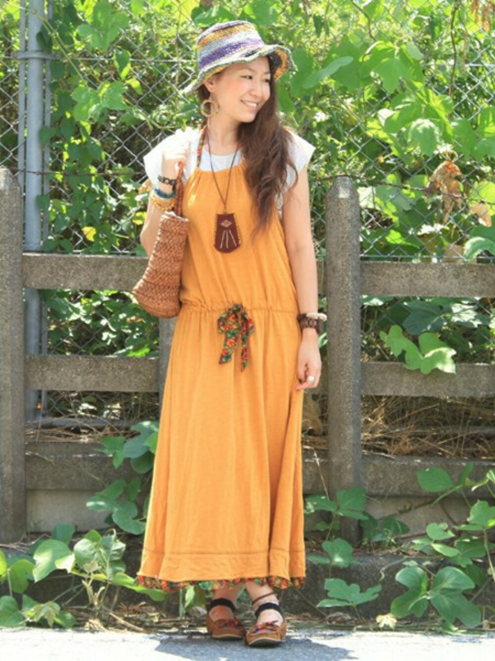 一見、プレーンなデザインのワンピにチラリと花柄の紐が光る☆小物でエスニックな雰囲気をプラスしました♪