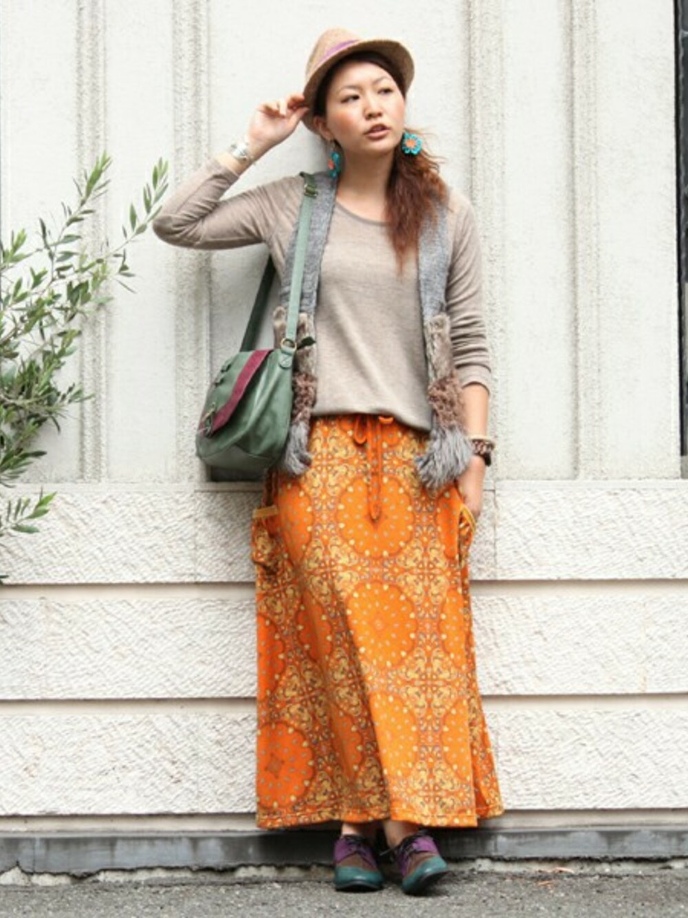 オレンジのバンダナ柄のスカートで女性らしくクラシカルな雰囲気に。 全体のアクセントにパープルを合わせてより大人な表情を演出♪