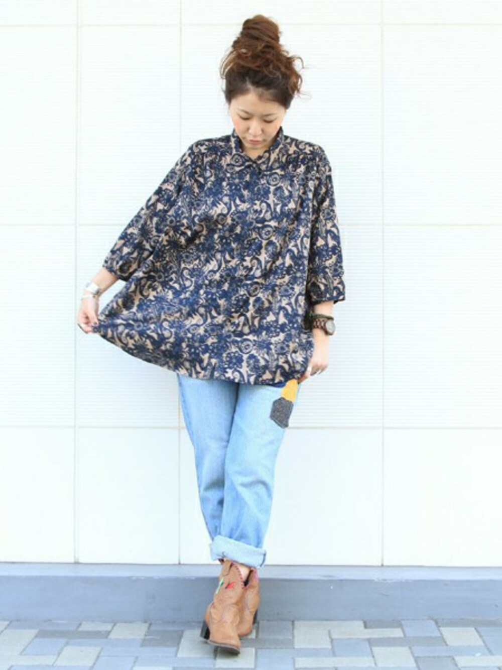 ちょっぴりレトロなムードの版画調のプリント模様のブラウスに、 ダメージ加工のデニムを合わせて。 足元はヒールを合わせ女性らしい雰囲気に仕上げました◎