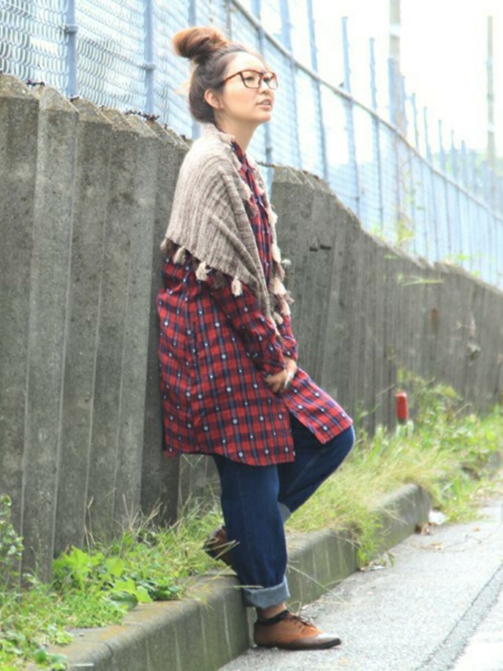 トレンドのチェック柄シャツワンピをゆるデニムに合わせてラフに着こなしたスタイル。 サッと羽織ったスヌードのフリンジでコーデにキュートなアクセントを♪ ボーイズライクな雰囲気で優しいイメージに。