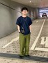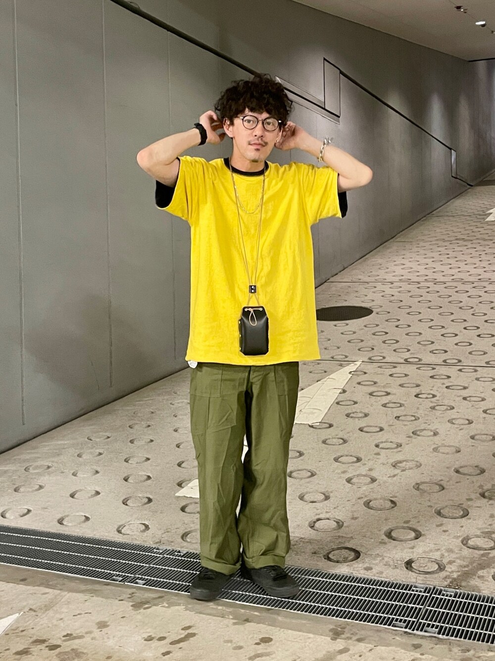 イエロー系のTシャツ/カットソー、グリーン系のカーゴパンツを着用したメンズの春コーディネートの1枚目の写真