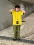 イエロー系のTシャツ/カットソー、グリーン系のカーゴパンツを着用したメンズの春コーディネートの2枚目の写真