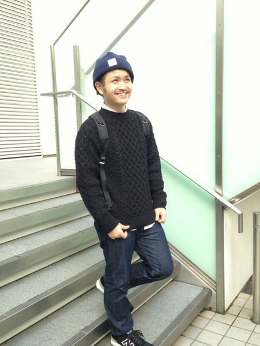 黒×ネイビーで男っぽく、 ケーブル柄もしっかり出ていてスタイリングがきまります!