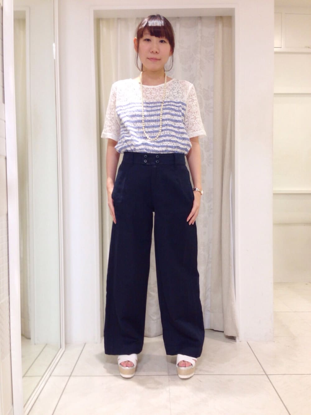 レース×ボーダーのデザイントップス♪ワイドパンツに合わせると今年らしさがぐっと上がりますよ☆