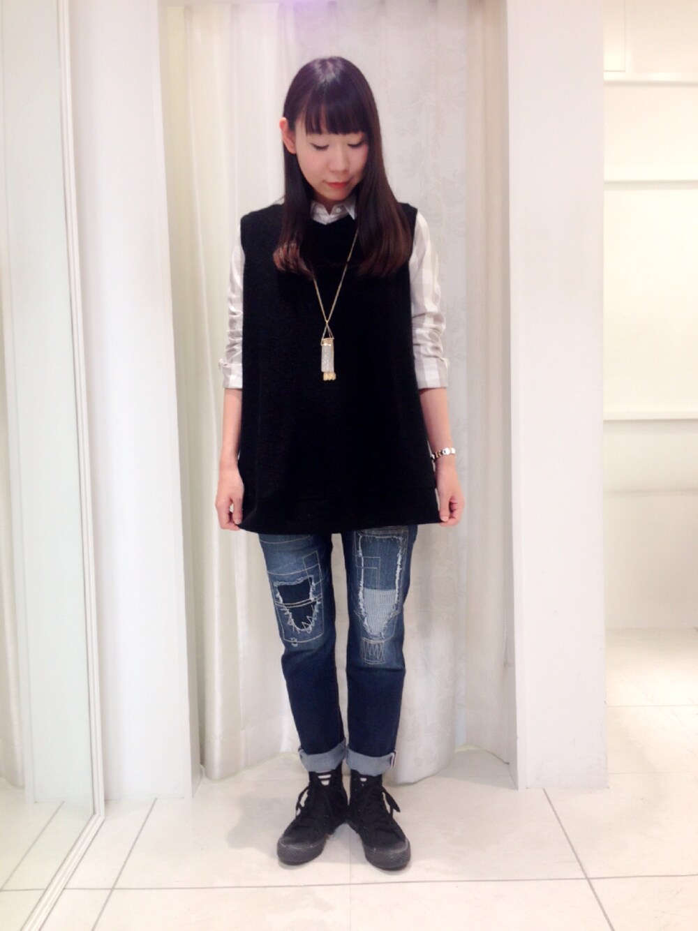 今、店頭で大人気のベストのコーデです!お見せできないのが残念なのですが、実はバックスタイルがぱかっと割れていて中に着たインナーがちらっと見えるんです♡ 丈も長めなのでゆったりシルエットがお好きな方にオススメです(*^^*)