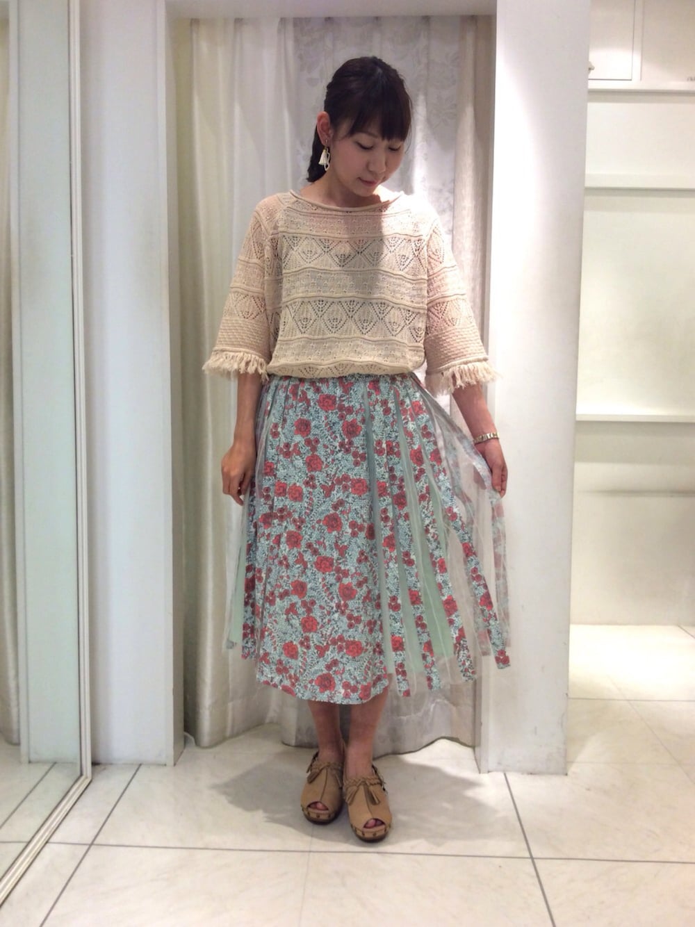 新作のフリンジニットと贅沢にもプリーツとチュールが一気に楽しめるスカートのコーデです😃❤️ ニットも薄手なので暑くなってきた今の時期にぴったりです😊