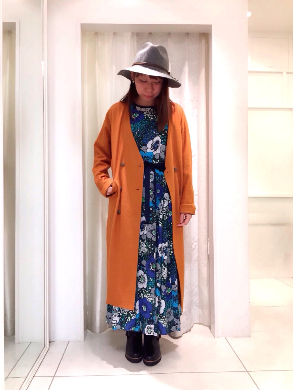 今日は珍しく柄のワンピース👗 レトロな花柄が可愛くないですか😍?? さらに鮮やかなマスタードのコートでレトロ感アップ💕です!!