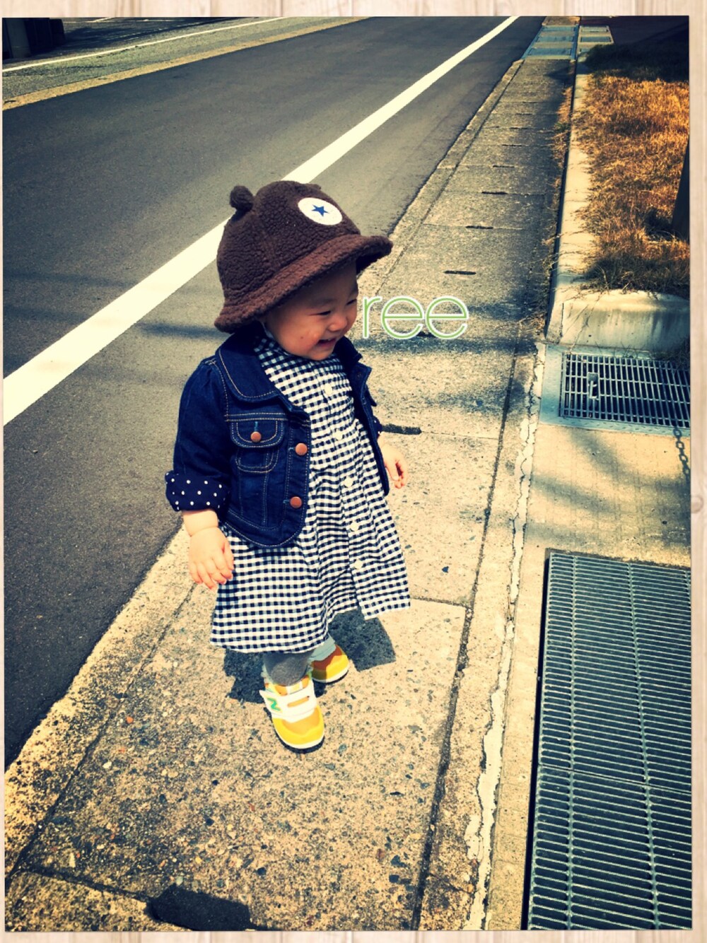 つるりんヘアーな娘のくまちゃん変身コーデ☆ 帽子を嫌がらず被ってくれるようになったので、新作の頂き物かわいいくまちゃん帽子被りましたー♡ ちびっこの被り物うける笑