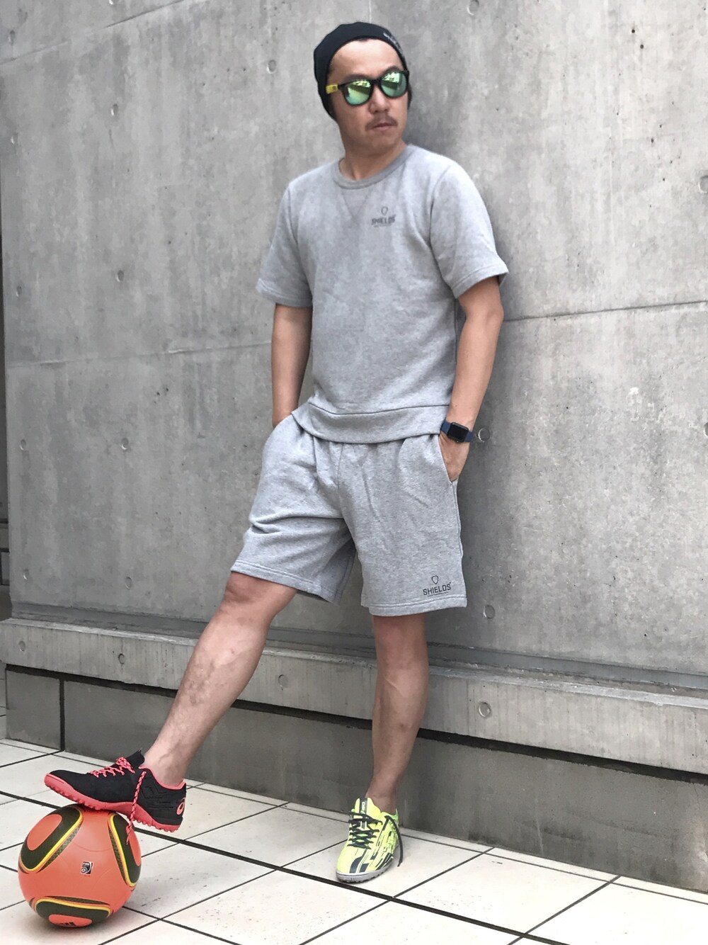 本日はトレーニングデー。 フットゴルフ日本代表オフィシャルサプライヤー、SHIELDS(シールズ)のセットアップコーデ。 グレーの色の質が品が良いです。