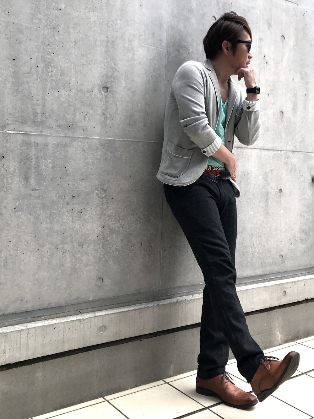 なかなか春になりきらないぐずついた曇天。 グレーのジャケットにニット地のスマートパンツをコーデ。 同系色のTシャツを合わせてこなれた感を。