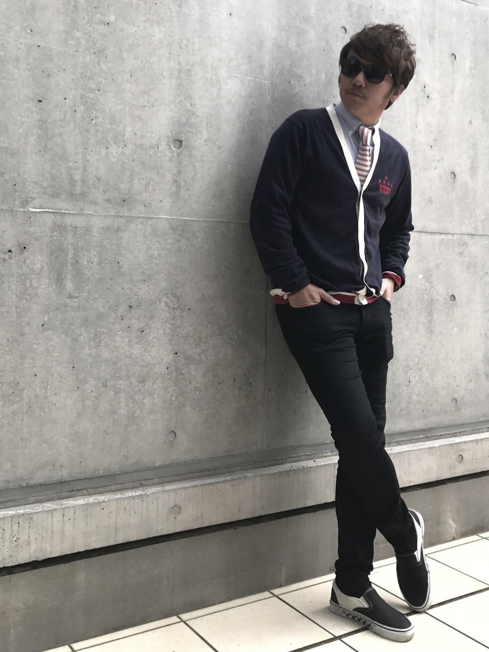 サクラも満開までもうわずか。 ラクなカーディガンとブラックパンツのシンプルコーデ。 カジュアルにネクタイは桜色をチョイス。