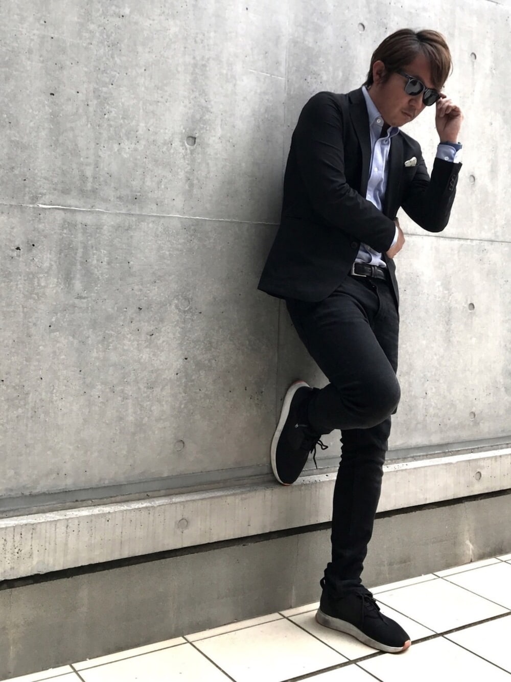 気分はブラックデニム。 スタンダードのオックスフォードシャツに定番ブラックジャケット。 足元はラフ&カジュアルなZARAのスニーカー。