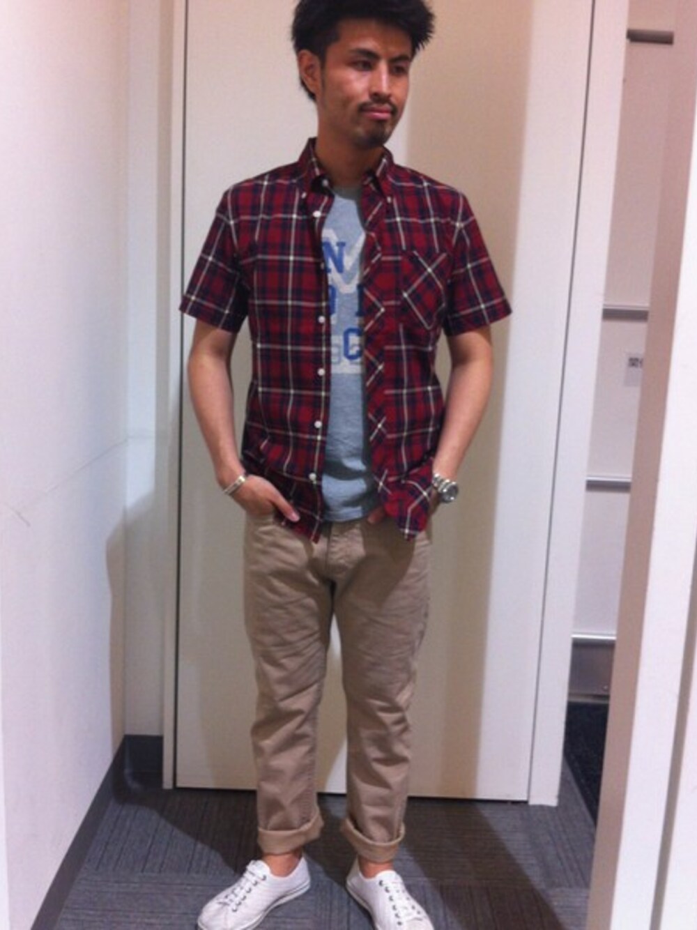 マックレガーカラーの赤のタータンチェックシャツで夏らしいスタイリングに♫ ボトムスは、綿麻なので涼しく着用していただけます。