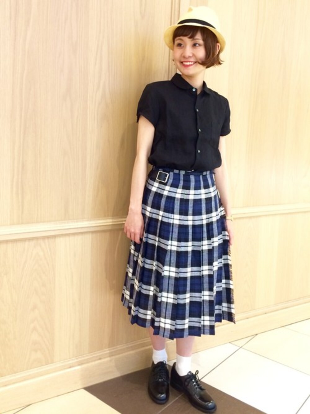 丸襟シャツはリネン素材で夏でも快適。チェック柄のスカートでスタイリングしました。