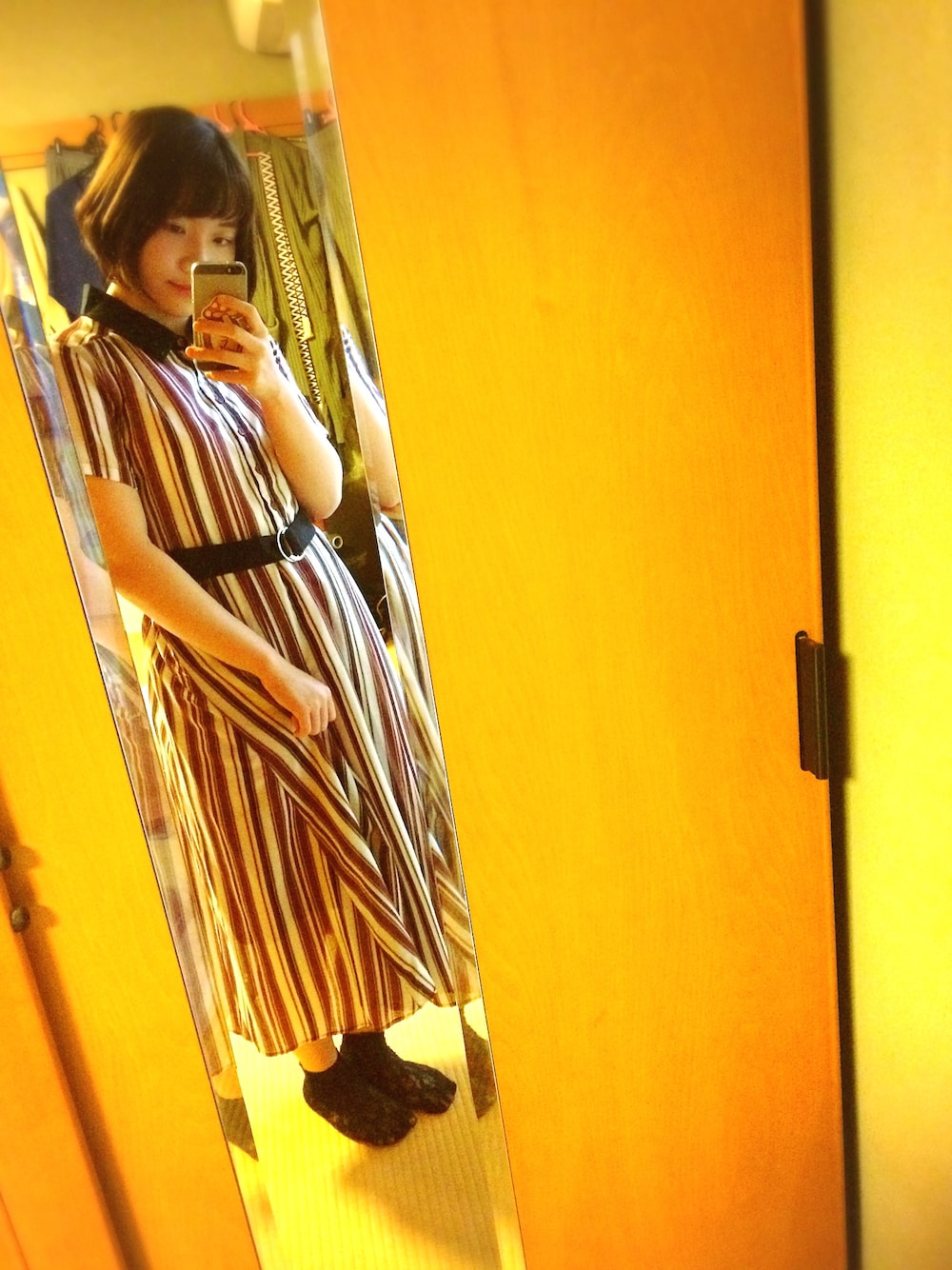 みんのシャツワンピース「マルチストライプシャツワンピ」を使ったコーディネート