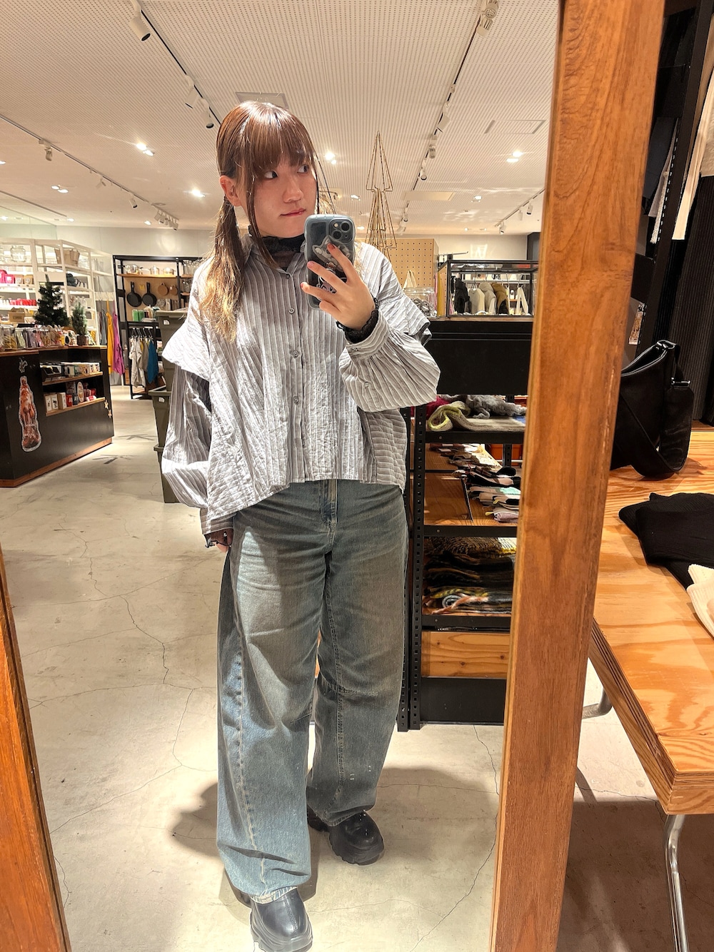 お気に入りのシャツに、黒のシアーインナーを合わせて、足元は動きやすくいつものブーツ! GUのバレルレッグデニム、持ってるお洋服に合わせやすく、重宝してます☺️