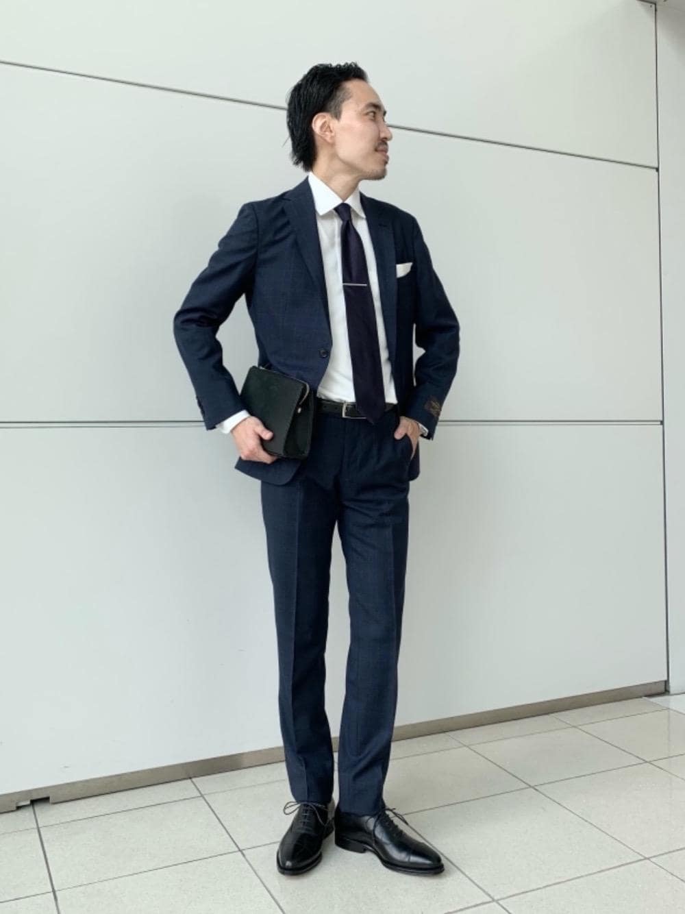 【年齢:30代前半】 【身長:175cm】 【普段サイズ:シャツ38/ジャケット46/ボトムス76/シューズ24.5cmから26cm】 【サイズ感】 シャツ:標準的 ボトムス:ややすっきり ジャケット:ややすっきり シューズ:標準的 【コーディネートポイント】 カノニコのセットアップを主役としたビジネスコーディネートを組んでみました。チェック柄のセットアップに白のシャツとソリッドのネクタイを合わせ、バッグと靴とベルトに黒を入れることで統一感が出て落ち着いた印象になります。