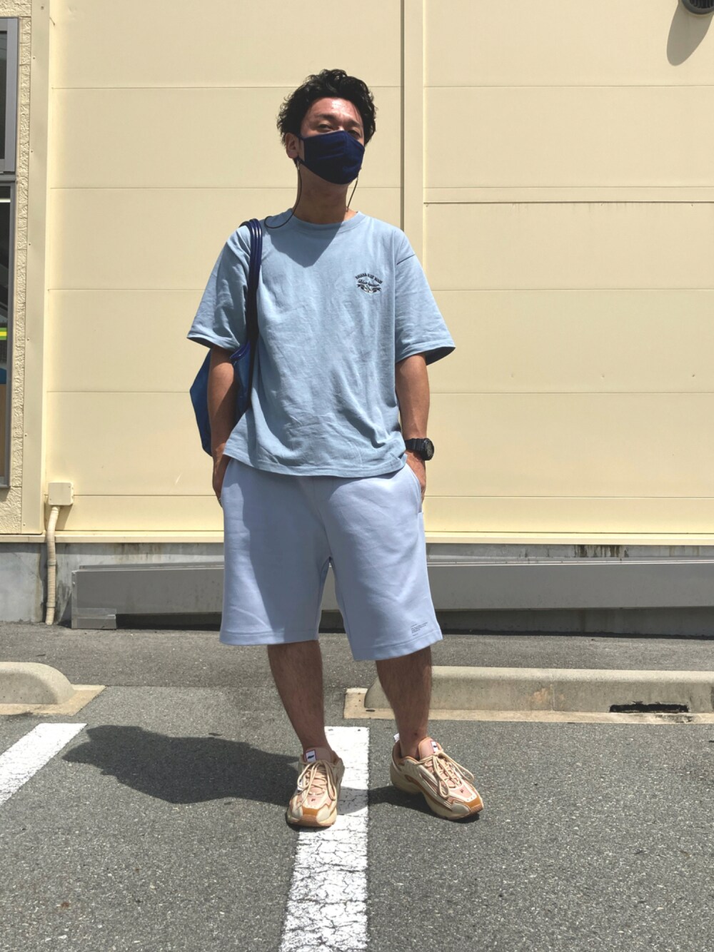 ブルーで統一してセットアップ風コーデ。ご近所買い物用のリラックススタイルです。