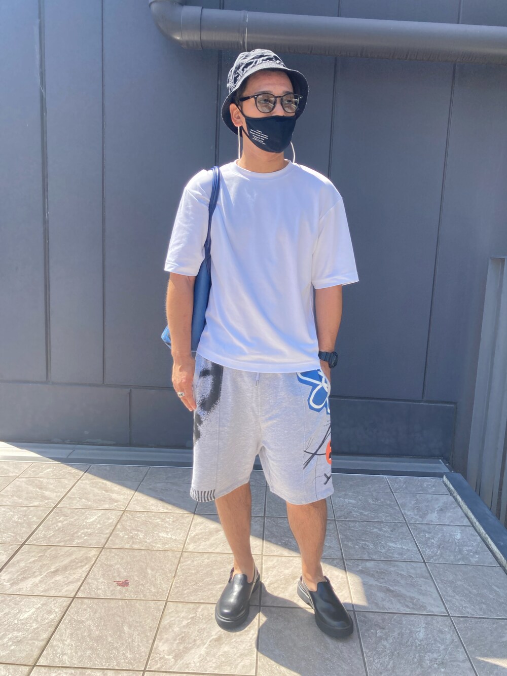 白Tシャツでシンプルコーデ。派手目の柄のハーフパンツとアクセサリーでアクセント。GUのエコレザーサンダルで足元はスッキリ。