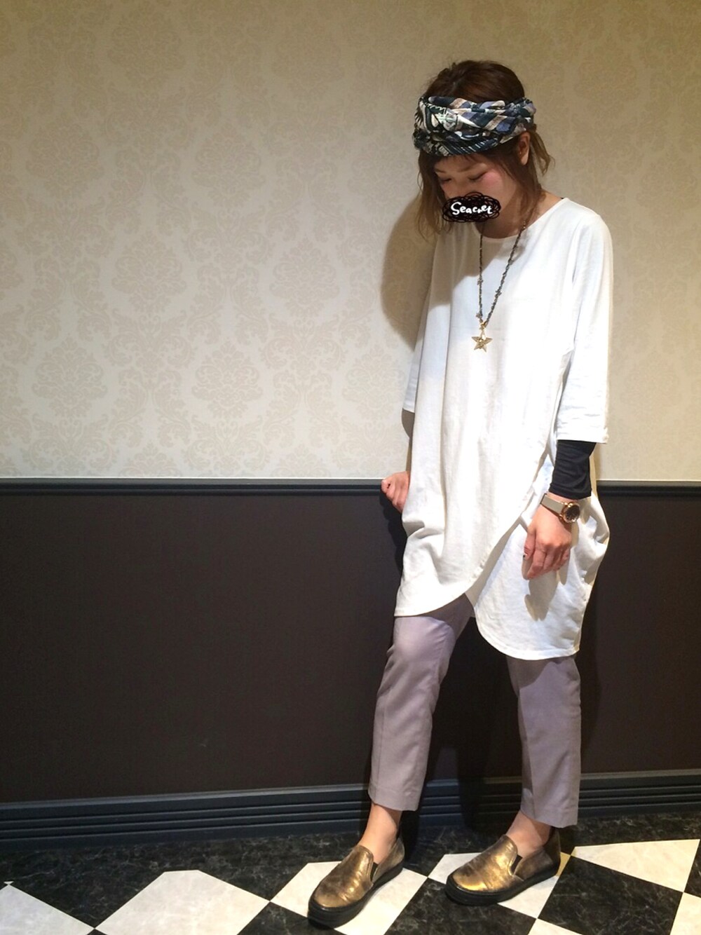 カラーと素材はキレイめ ですが、 ネックレスと ターバンの柄・素材など 小物類は外したテイストに、、、 ちょっぴりボヘミアン風ですっ☺︎