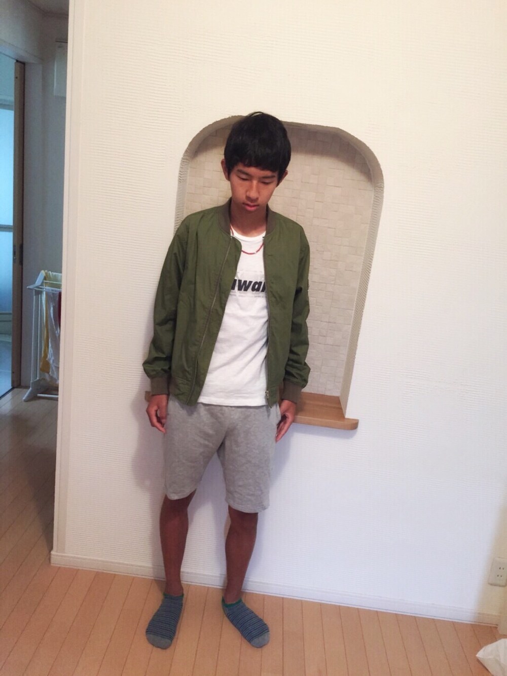 今日は少しラフなコーデ!! ちょっと薄めの生地のMA-1に白のワンポイントのTシャツ!! パンツはスウェット生地!! 靴はMA-1の色と揃えて緑の靴!!