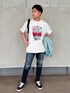 「今回は、トムとジェリーTシャツにSHARE BIGシャツを合わせました! ダメージスキニーにタックインすることにより少しシルエットがスマートに見え、ウェストバッグを肩から下げてお出かけ風なイメージで組み合わせてみました!!」 (※ 腕時計, スニーカーは私物です。)