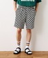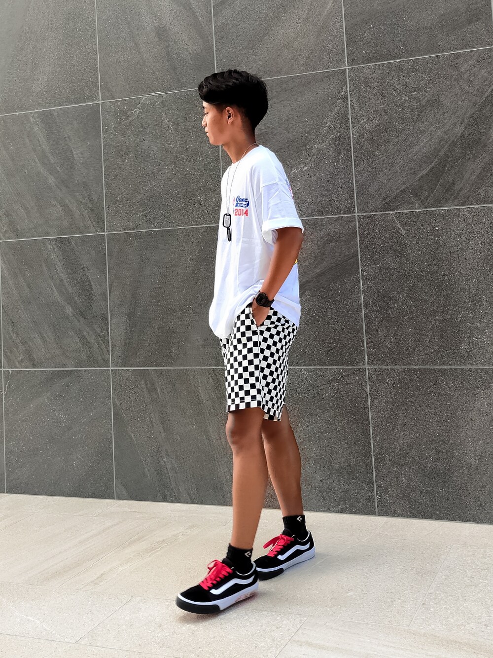 カレッジ風ワッペンプリントTシャツ & 出勤時や休日スケボー等する時にもよく履く「Dr.ショートパンツ」のCHECKERパンツコーデ🏁 バケハやCAPと合わせたり、サングラスなどの小物を合わせるのもありですね👍」 (※スニーカー, 腕時計, ネックレスは私物です。 着用アイテムの詳細はプロフィールのURLよりご覧になることができます🙏)