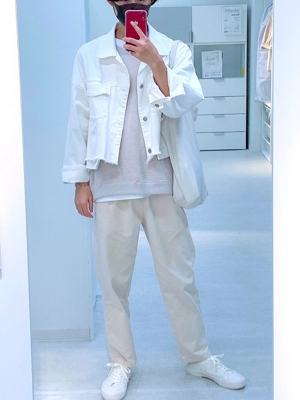 白コーデ 流石に白すぎ? パンツはGUのシェフパンツのSサイズ スニーカーはUNIQLOの最近発売されたものです 見づらいけど手首につけているアクセサリーは自 分で作りました このHAREのアウターはポイントだったりクーポ ンなどで5000円ぐらいで買いました(お買い物上手アピールw)