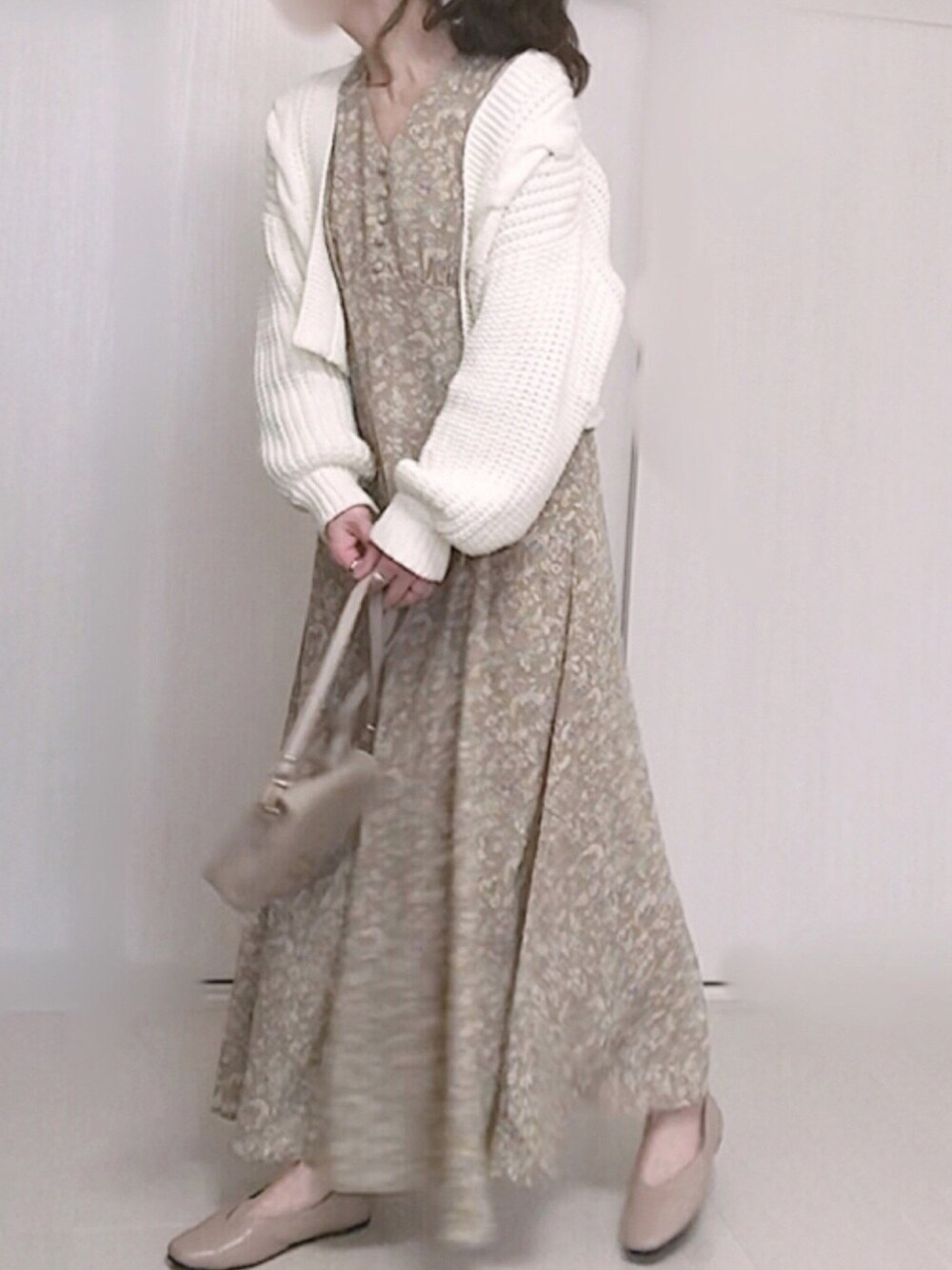 mystywomanさんのペイズリーフラワーワンピース。 柄にパープルが入ってるのが可愛いと思いました❤︎ そして、かなりの美シルエットワンピースです。美シルエットを見せるために、カーディガンはショート丈を合わせました。 ワンピースが大好きな私は一目惚れでした😍