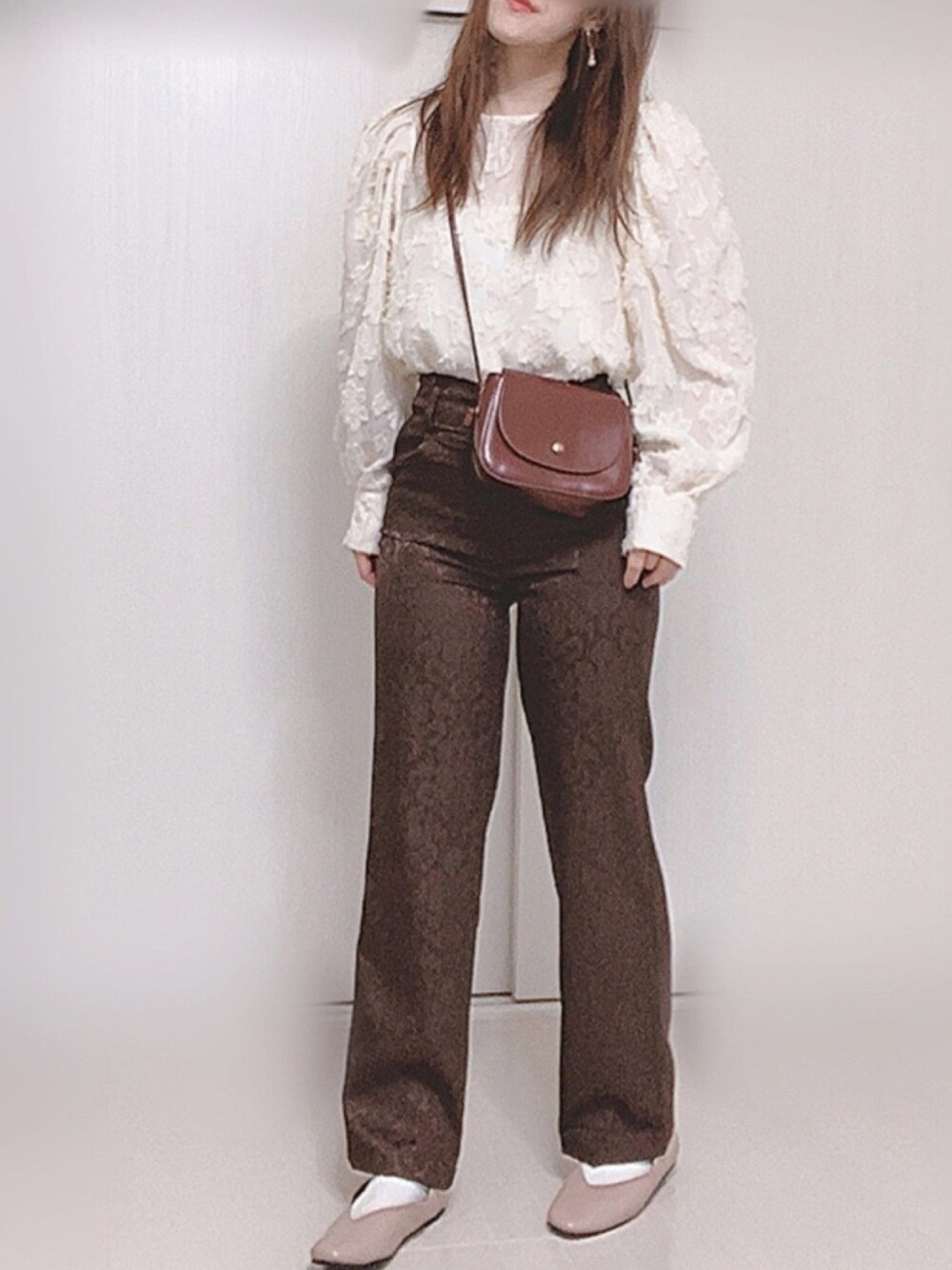 Ⓜ︎のシャツ/ブラウス「フロッキー花柄パワショルブラウス」を使ったコーディネート