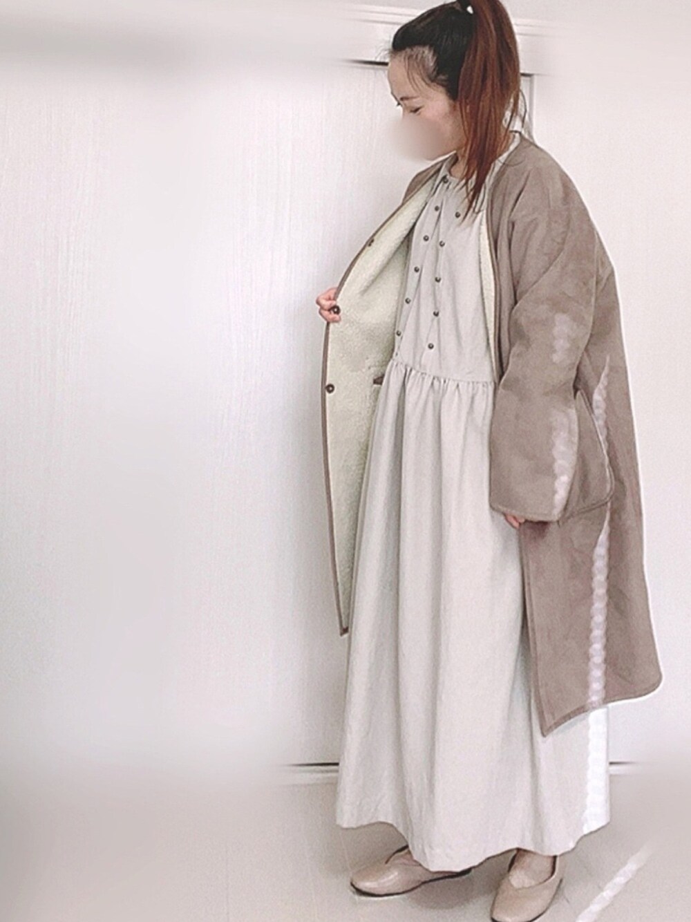 🟤sakishimatokyoさんの。 ダブルボタンワンピース。 ベージュを着用しています。 ゆったりサイズで、スエード風の生地です。 ガーリー好きな人には特にオススメのアイテム✨