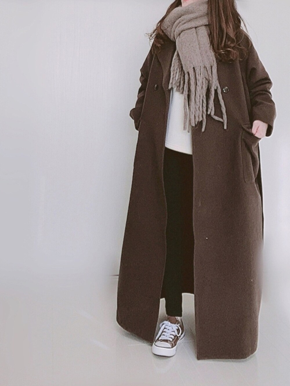 Ⓜ︎のチェスターコート「【EMMA】オーバーサイズ ダブルボタン ラグランスリーブ フラップポケット付きロングコート」を使ったコーディネート