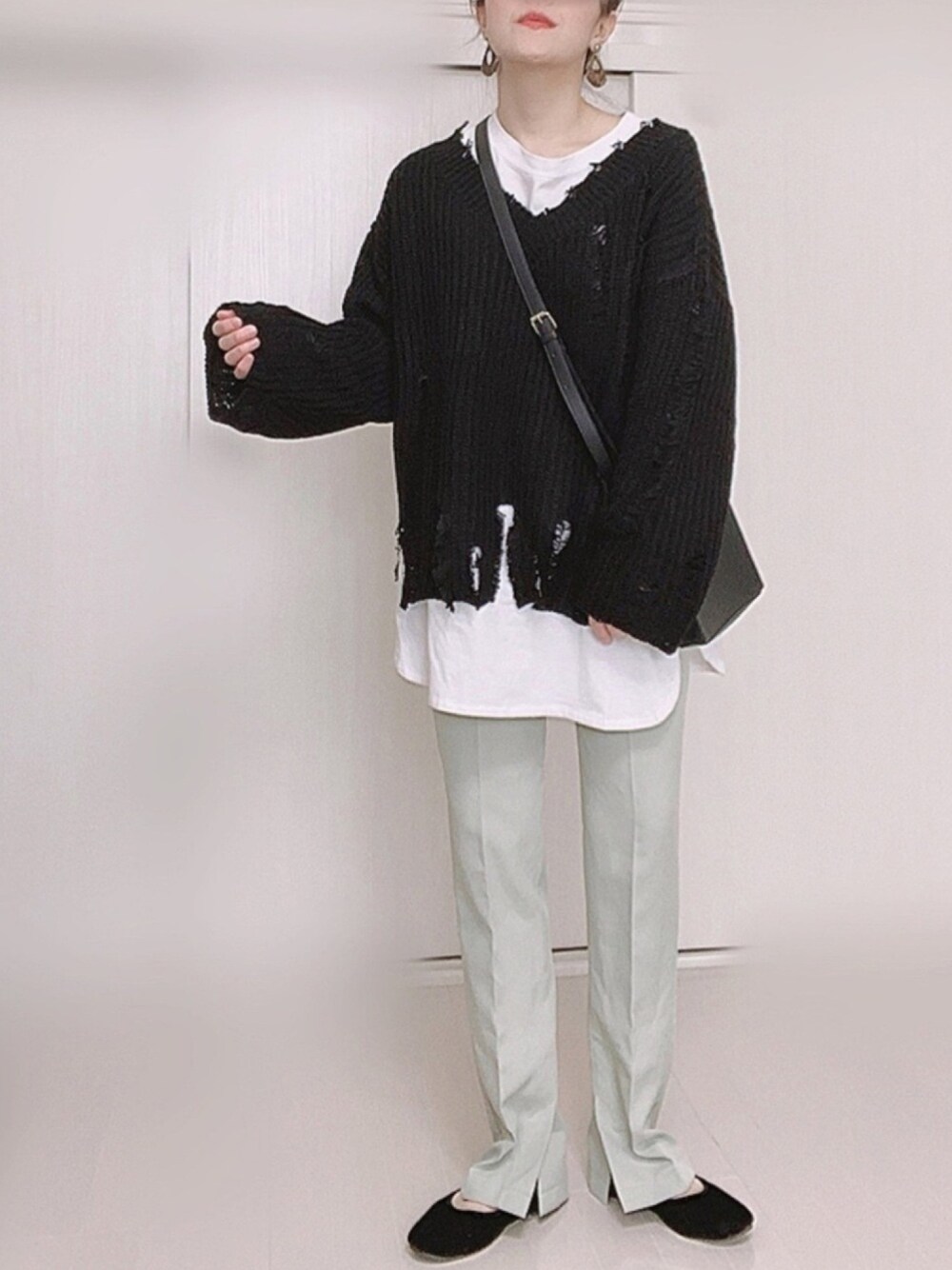 🟡roger and rowさんの。 ダメージニット。 Vネックと裾のダメージでレイヤードコーデがおしゃれにきまるアイテムです。 とてもお気に入りです✨