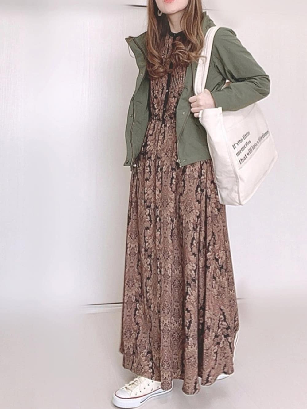 Sonny Labelさんのマウンテンパーカー×ダマスクプリントワンピースでカジュアルガーリーコーデ。 可愛いです❤︎