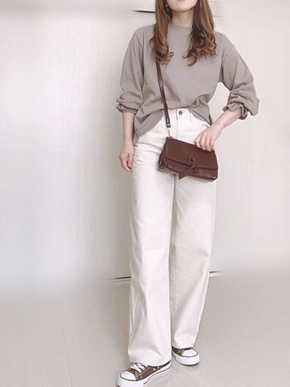 🟤recaさんの。 タックスリーブカットソー。 タックスリーブがオシャレで可愛いアイテム。 グレイッシュベージュを着用しています。 タックインがお気に入り。