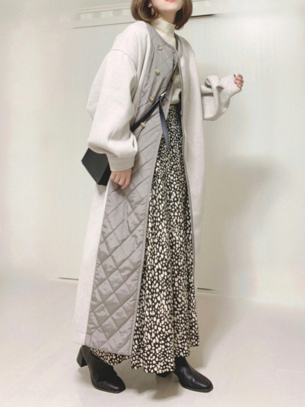 Ⓜ︎のノーカラーコート「アシメキルティング配色コート」を使ったコーディネート