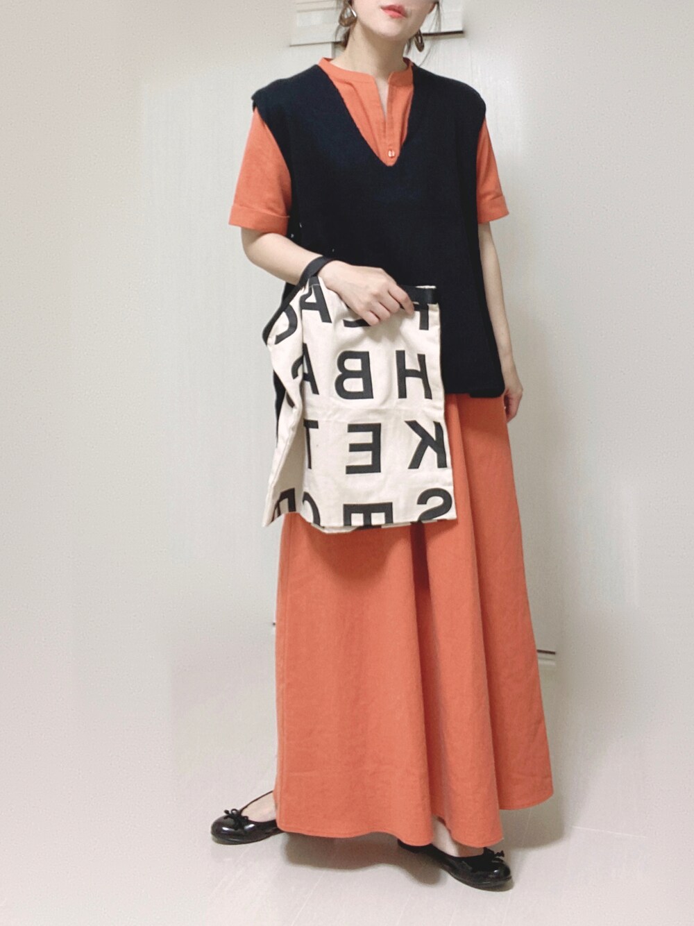 🟧ITEMS URBANRESEARCHさんの。 ドライコットンワンピース スカートのシルエットが絶妙でとってもお気に入りのワンピースです。スキッパー風のデザインがおしゃれで女性らしさを演出しています。 このオレンジの色味も絶妙でとっても可愛いです🌷 今日はニットベストを合わせてみました。ウエスト部分が紐で調節できるので1枚で着ても、本当にシルエットが素敵なんです✨