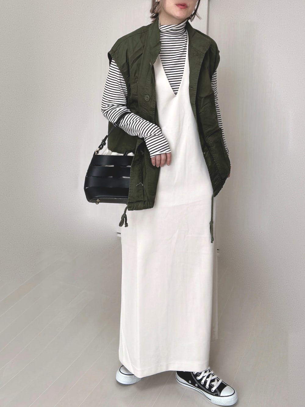 Ⓜ︎のワンピース「ポンチVネックワンピース」を使ったコーディネート
