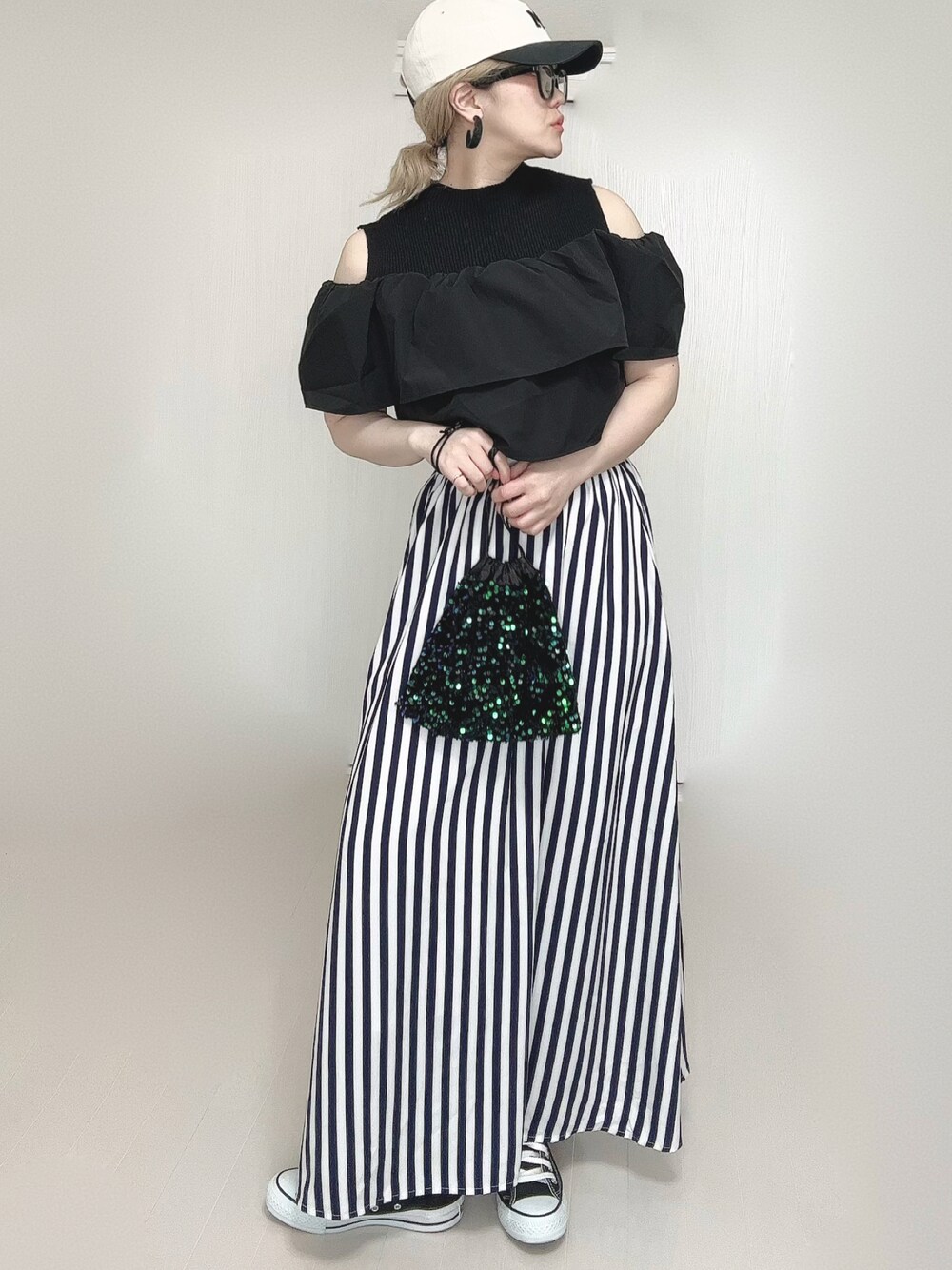 トップスはGRL 巾着バッグはOUTLET
