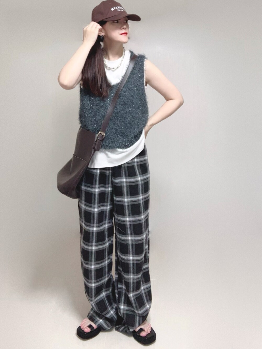 今期トレンドのフェザーベストは やっぱり Tシャツやノースリーブと レイヤードするのが好きです🩶 チェックパンツと合わせて大人カジュアルに。 キャップ&バッグ&パンツはSHEIN #pr #tiptop .°・。_______ zozotownにて24時間限定クーポン発行中