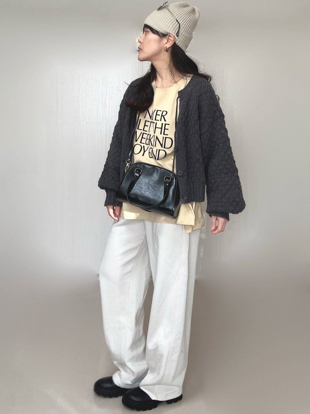 Ⓜ︎のニット/セーター「ポコポコ編前後2wayカーディガン」を使ったコーディネート