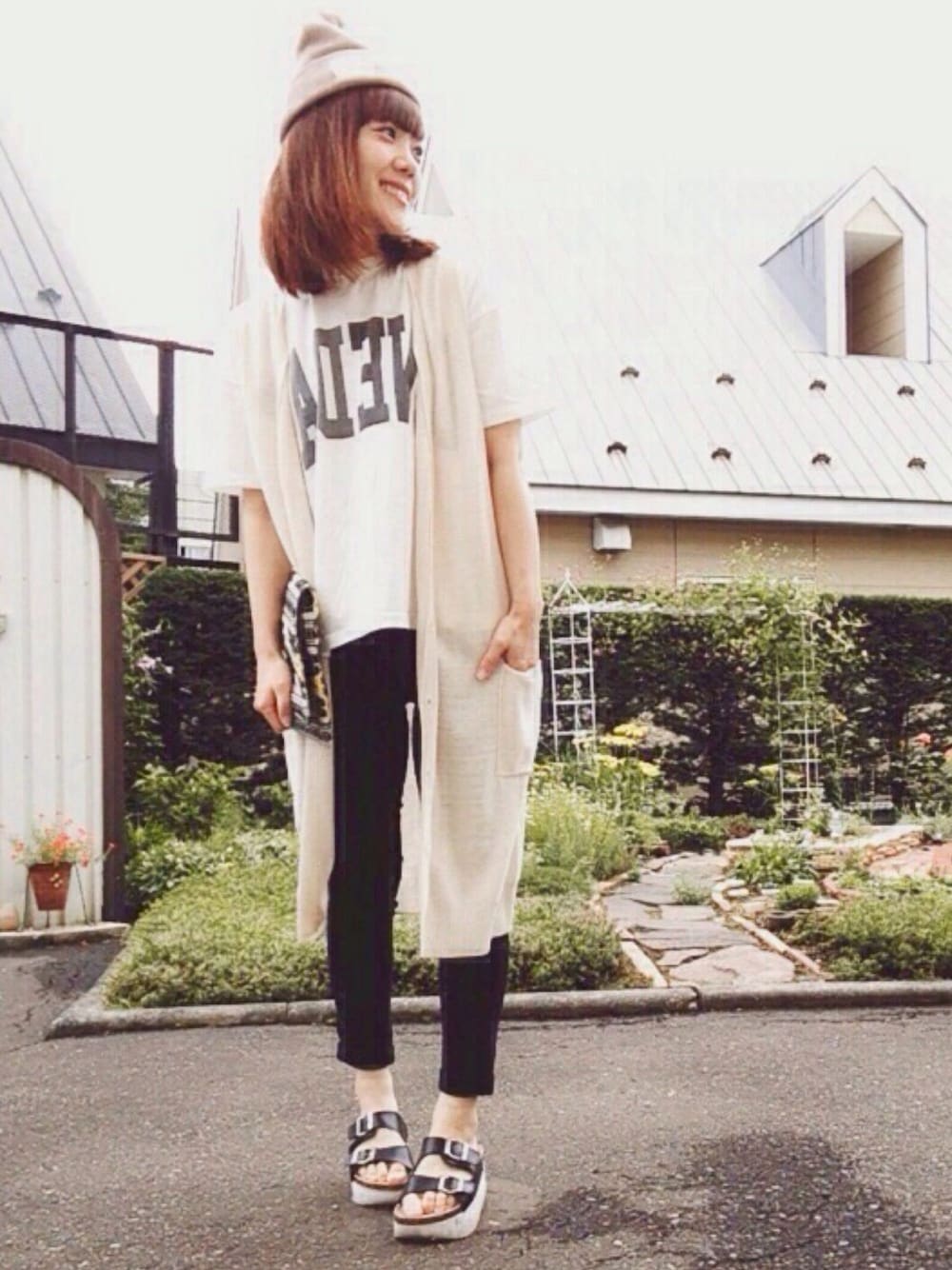 少し髪の毛伸びてきたー♡ 早く伸びて〜! あ、すいません。 今日は70%オフになってたため、即買いしたロングジレを使ったコーデです。 お気に入りのビッグロゴTとボトムは黒スキニーで、足元はスポサンにしました。 小物にクラッチとベージュのニット帽を合わせて。。。 夏のモノトーンコーデ☆