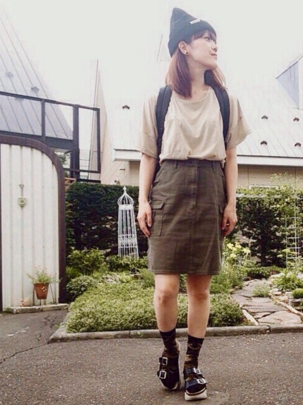 ベージュのビッグTに カーキのカーゴスカートを合わせました☆ 靴下はカモフラ柄を使ってます。 ニット帽とリュックとスポサンを黒にして全体を締めました🎶