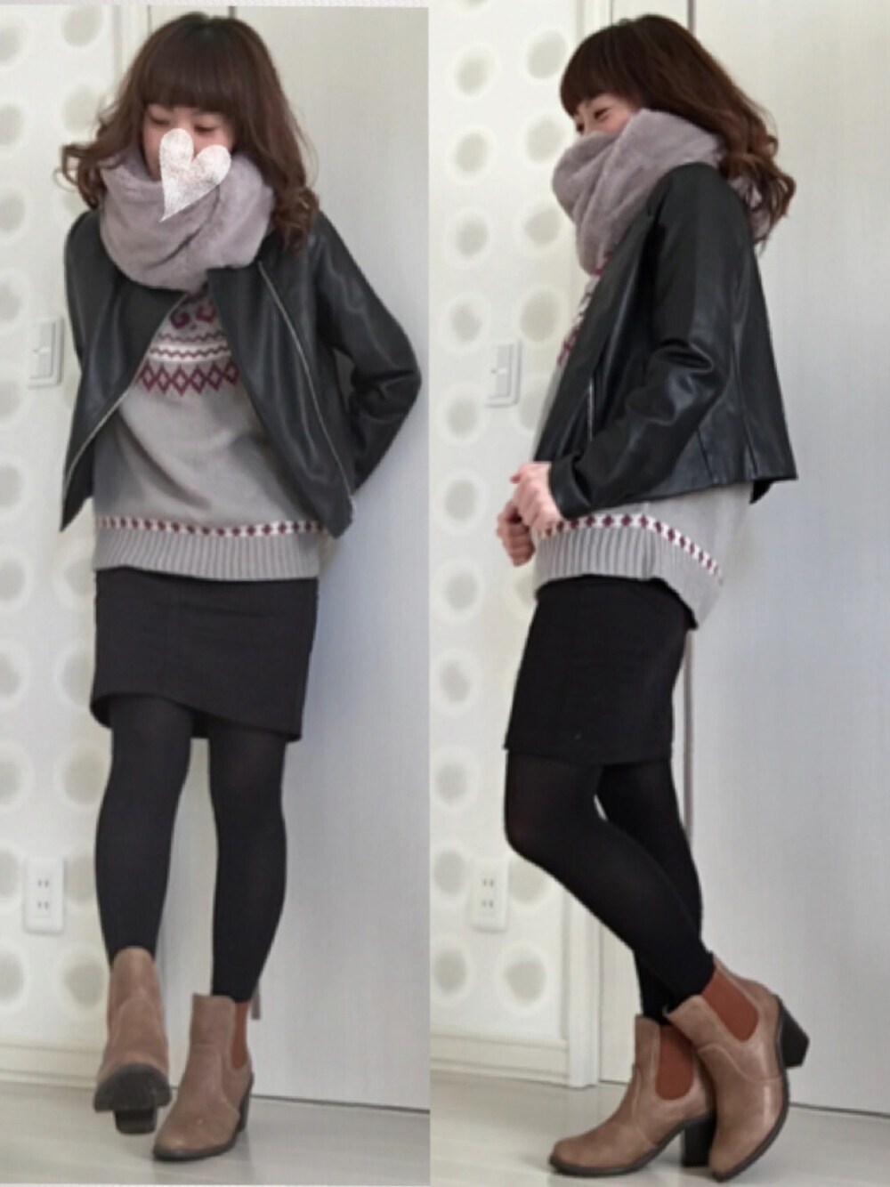 古着特集vol.3 おはようございまーす❤️ 今日もニットが古着😁 ノルディック柄?のニットに 黒のタイトなミニスカートを合わせて ライダースジャケットで辛口に。 ファーのスヌードで甘く。 足元はサイドゴアブーツにしました😆