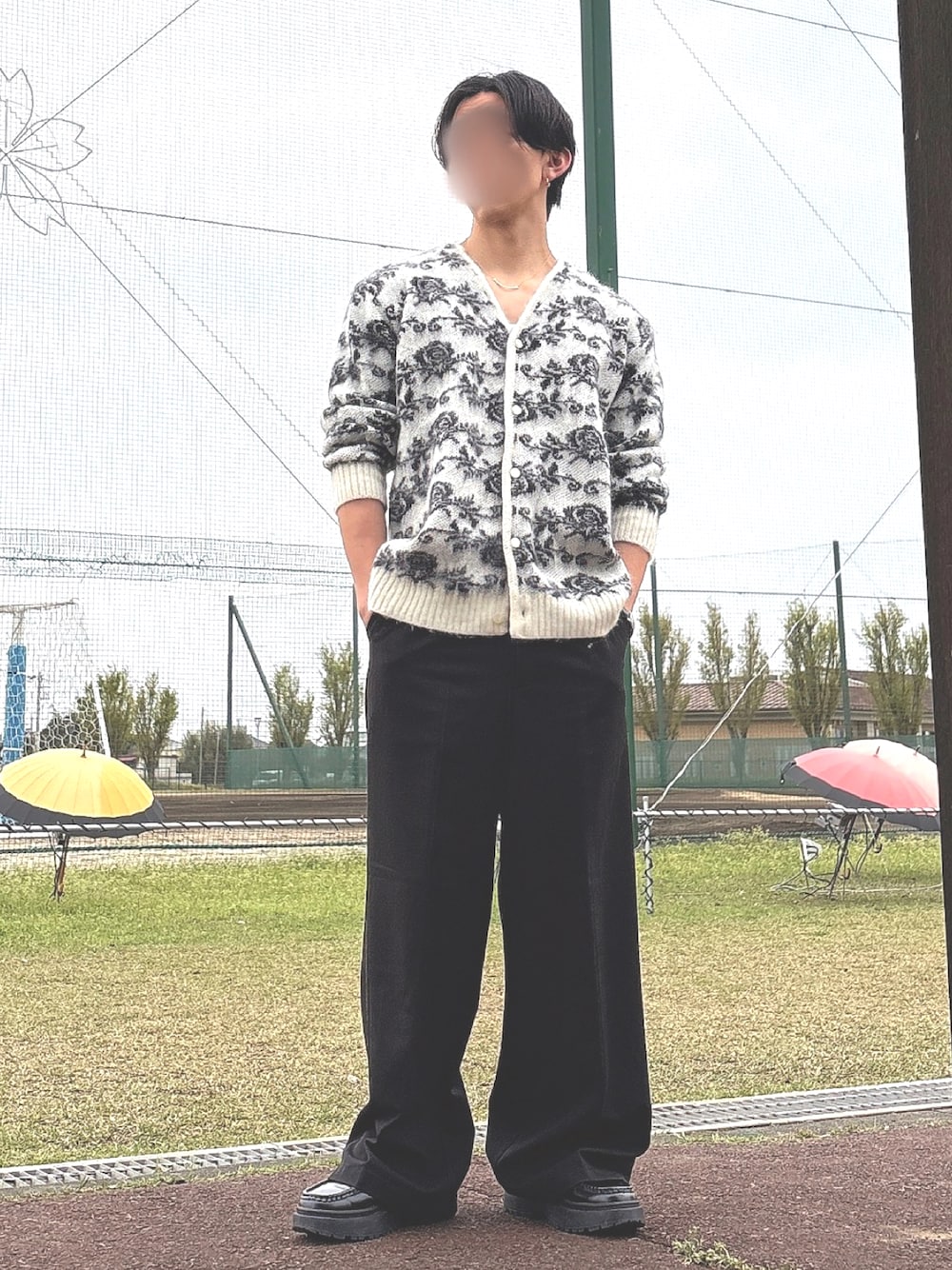 needlesのカーディガンは柄の主張が強いですが、全体をモノトーンでまとめることで派手すぎないコーディネートにしました。ワイドスラックスにローファーでキレイめながら力の抜けたラフさが最近の気分。