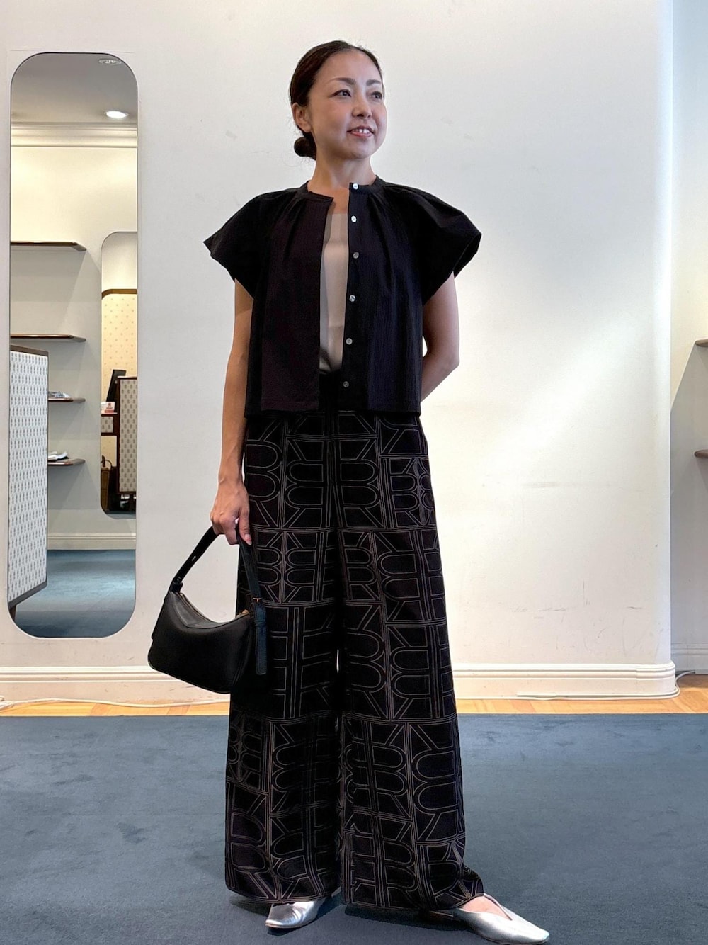 ブラックのワントーンコーデですが、デザイン性のあるブラウスとモノグラム柄のパンツでアクセントのある雰囲気を出しました♪ ショッピングやお友達とのランチにもおすすめのコーデです。 ▪️店頭及び屋外での撮影画像は、光の当たり具合で色味が異なって見える場合がございます。 商品の色味はスタジオ撮影の画像をご参照ください。 ▪️♡ボタンを押してお気に入り! お気に入りしていただくと、気になったコーディネートや商品がチェックしやすくなります。 スタッフのフォローもあわせてご利用ください。 ▪️LINE接客承ってます! 聞きたいことはあるけれど電話するお時間がない方、なかなか外に出られないという方、お取り置きなどもお伺い出来ます! 是非、お気軽にメッセージ送ってください。 【友だち追加】をタップをして下さい <a href="https://lin.ee/BOiLFBA" style="background:url(https://scdn.line-apps.com/n/line_add_friends/btn/ja.png); background-size: contain; display: block;width: 116px;height: 36px; margin:.5em 0;"></a>