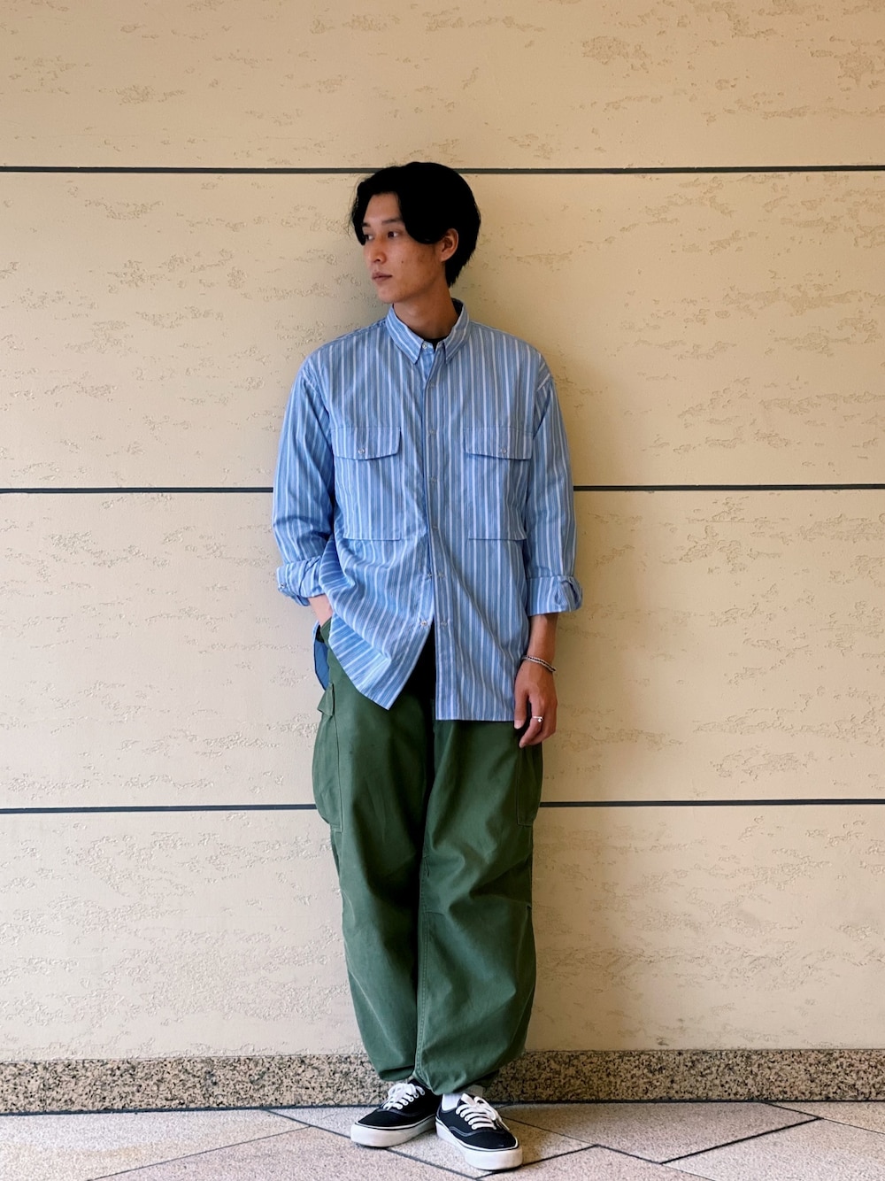 EKALのシャツはWポケットにスナップボタンと、アウターのようなデザインになっております。 シンプルになりがちな夏こそ、こう言ったアイテムで楽しみたいですね。